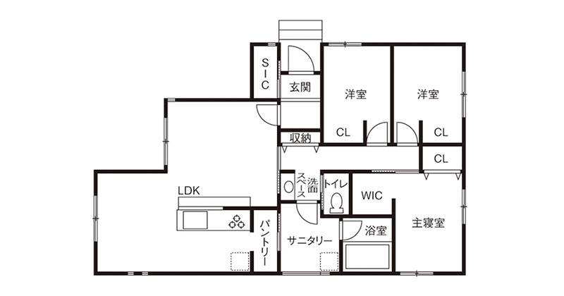 人が集まるLDKと主寝室・洋室などプライベートな空間を分けた平屋の間取り。キッチンからパントリー、サニタリースペース、洋室や洗面所へと水まわりをまとめて配置することで回遊しやすい設計に仕上げられています。